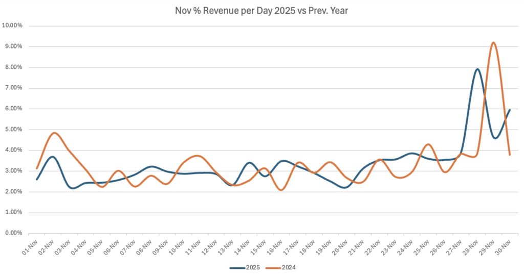 In contrast, 2025 started more softly and consistently. Daily performance was smoother, suggesting brands paced activity more deliberately. Rather than exhausting demand early, restraint proved more effective in preserving momentum for peak.